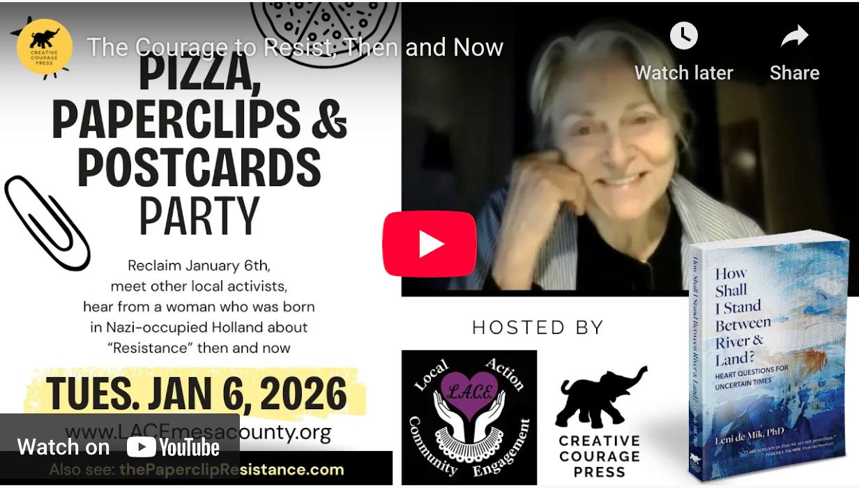 Below is the recording of our January 6th event. Leni (pronounced “Lainey”) shared about her early years, born in Nazi-occupied Holland, emigrating at age 8 to Canada, inspired by her father’s courage in the Dutch Resistance, offering wisdom about our own forms of Resistance today. The next morning after that event, Renée Good was killed less than 4 miles from Leni’s home in Minneapolis. Since then, I keep returning especially to Leni’s words of encouragement in the first 45 seconds! The world continues to become an even smaller place needing compassion.