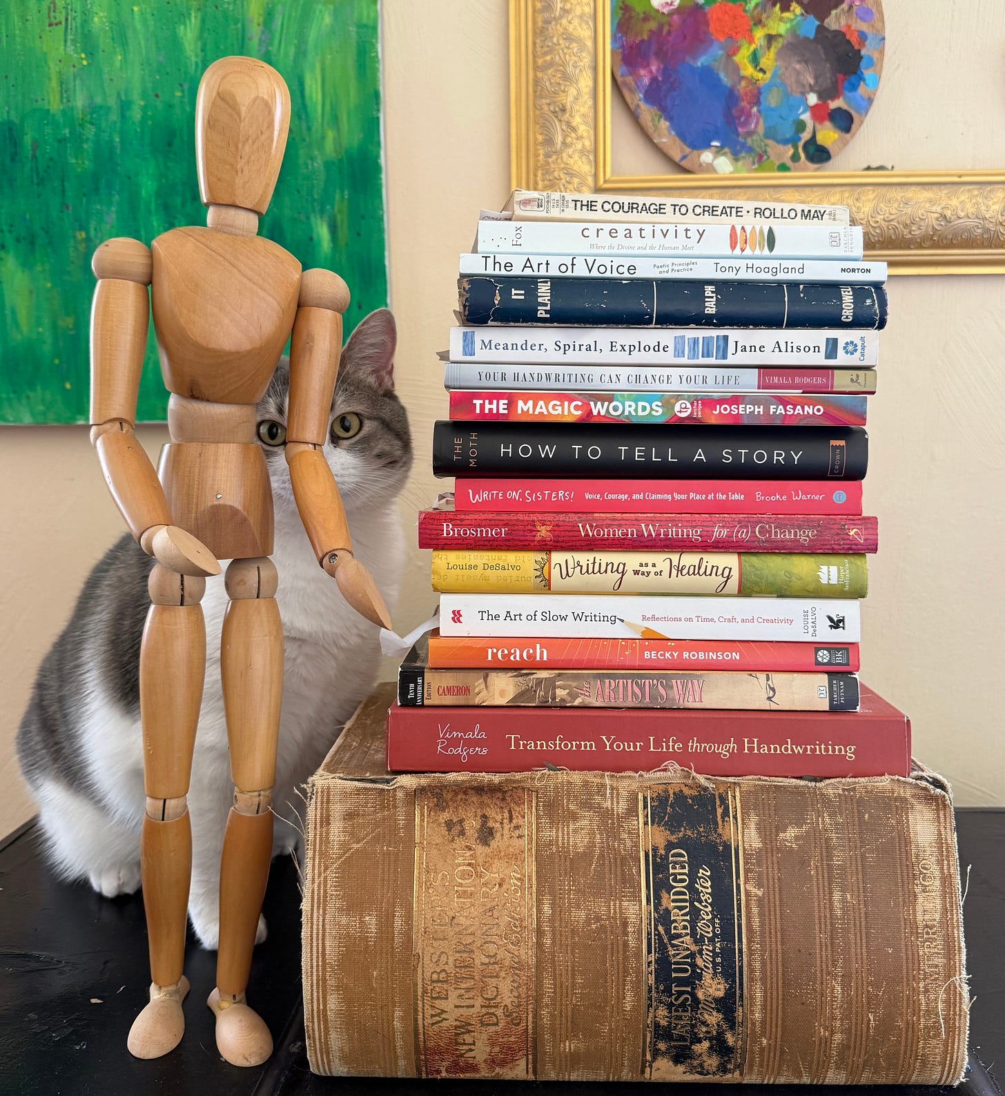 Where do you find the brave space and motivation to write? What’s the story behind the “how to” writing books on your shelf? Who or what gives you courage to write? (A cat-invaded photo at the end shows my favorites!)